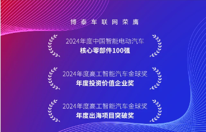 在“2024中国智能电动汽车产业链100强论坛暨第十一届电车人大会”上,博泰车联网荣膺“2024年度中国智能电动汽车核心零部件100强”。并在2024高工智能汽车年会暨年度金球奖颁奖典礼上,一举