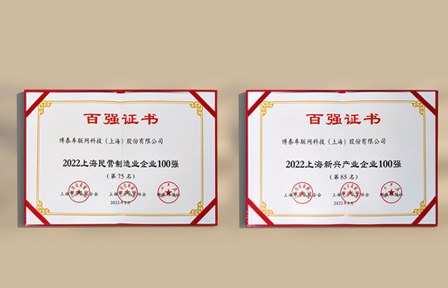8月30日,2022上海百强企业名单发布,博泰暨2021年当选后今年连续入选,获得民营制造业100强第75名、新兴产业100强第85名,再次收获双百强企业荣誉。