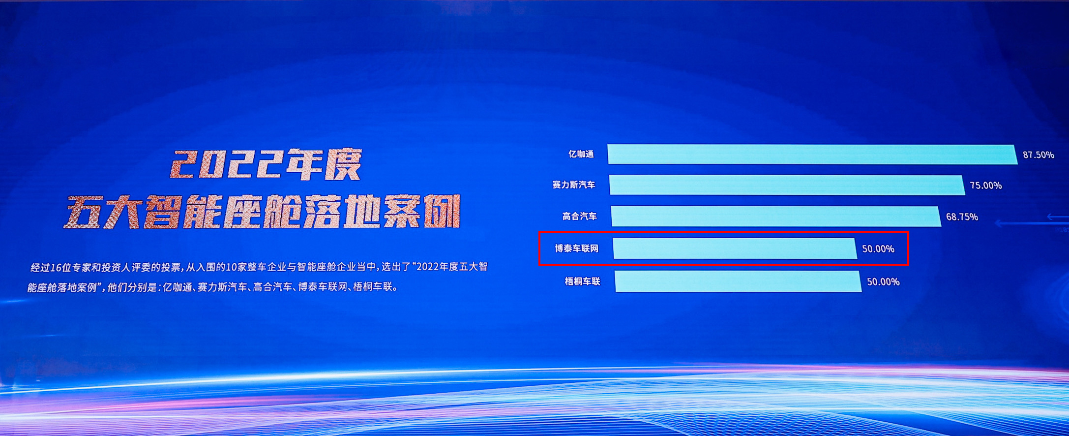 此外,博泰车联网依托自身在智能网联、操作系统、芯片技术等核心竞争要素上拥有显著的先发优势,以及在技术研发设计、生产制造、业务拓展等领域有着完备的全链条综合能力,在由《证券日报》社和中欧经济技术协会联合主办、中信证券协办的“2022汽车资本论坛”上,强势入围了 “五大智能座舱评选案例”。
