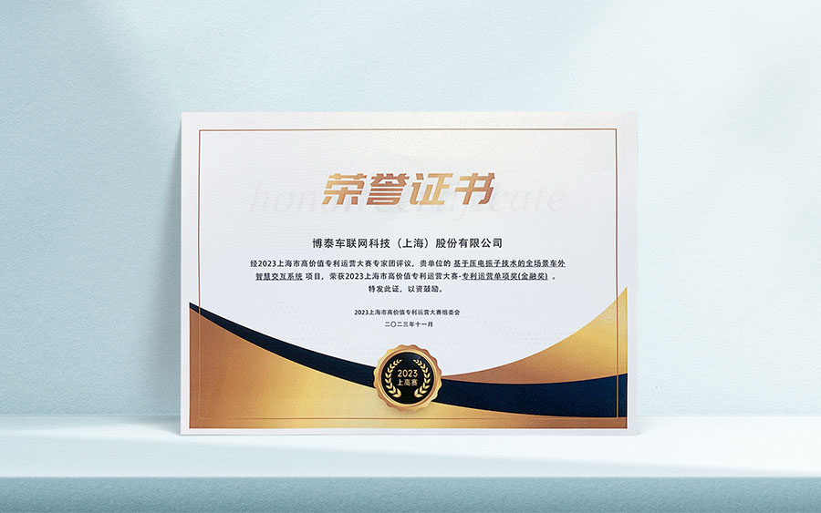 在2023年上海技术交易所、上海市高校科技发展中心、上海市知识产权服务中心联合举办的上海市高价值专利运营大赛中,博泰又凭借“基于压电振子技术的全场景车外智慧交互系统项目”,以及完善的高价值专利布局、专利运营成就入围专利运营价值榜,并获得专利运营金融奖。