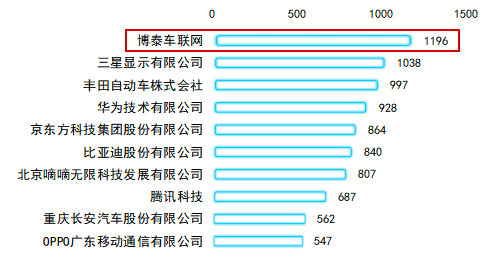 在我国平台技术领域专利申请人TOP10中,博泰以1196项专利位列第一,领先三星、丰田、华为、腾讯、比亚迪等一众国内外行业巨头。