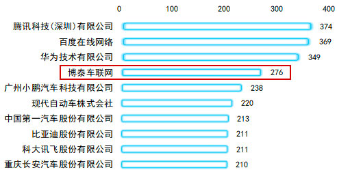 在人机交互专利申请人TOP10中,车联网领域博泰排名第一。