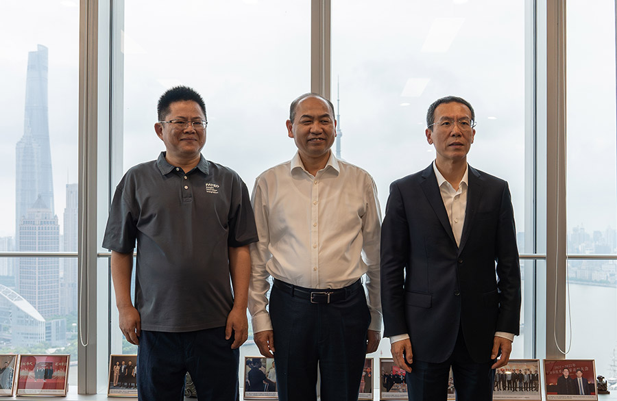第十四届全国政协副秘书长、全国工商联党组成员、副主席邱小平(中),中国信保党委委员、副总经理张辉(右),博泰创始人应宜伦(左)合影留念