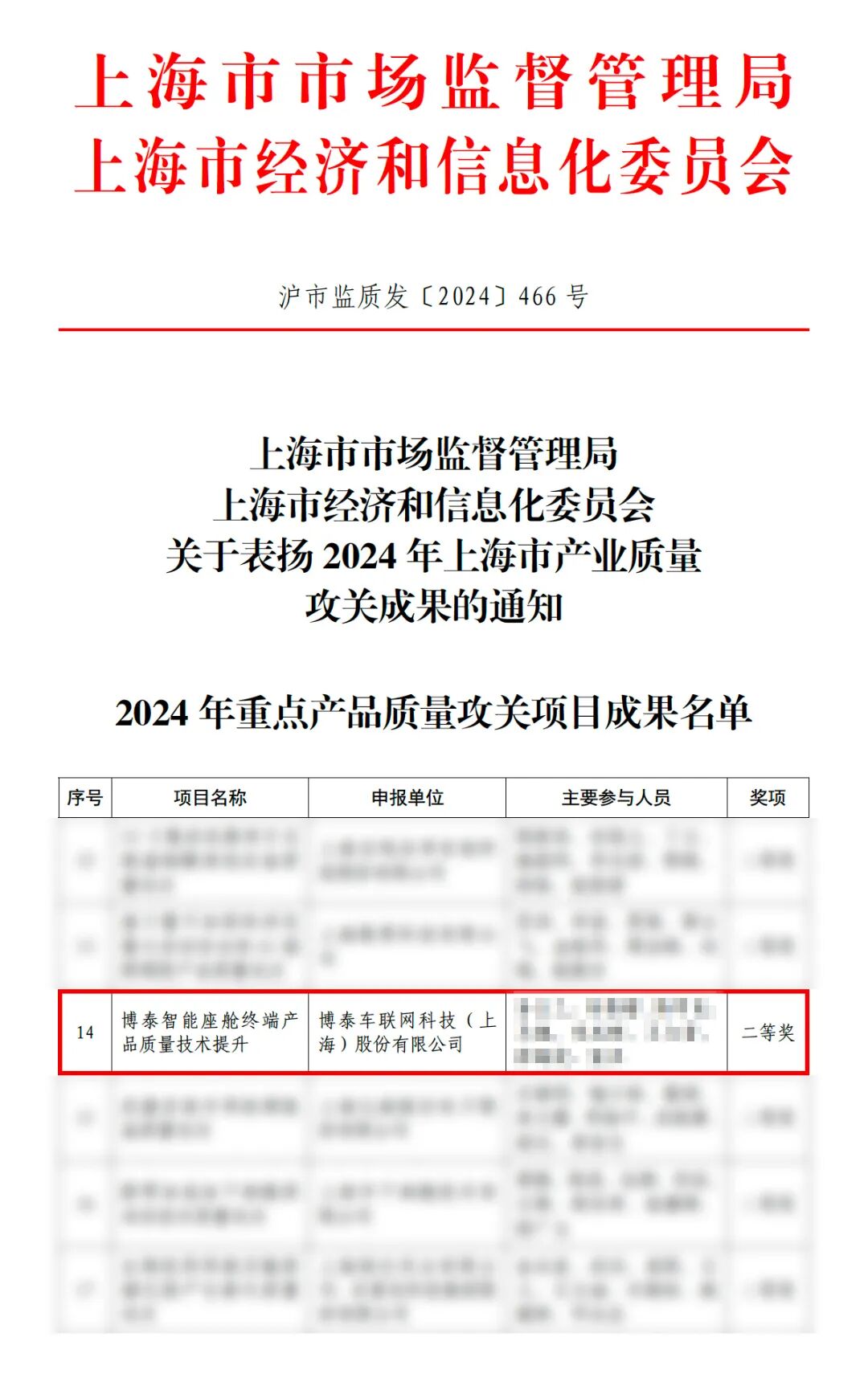 为贯彻落实国家《质量强国建设纲要》、上海市《质量强国建设纲要上海实施方案》中有关“重点产品、行业质量攻关”的要求,引导企业提质增效,上海市开展了质量攻关成果的申报。**博泰车联网申报的“智能座舱终端产品质量技术提升项目”获二等奖。