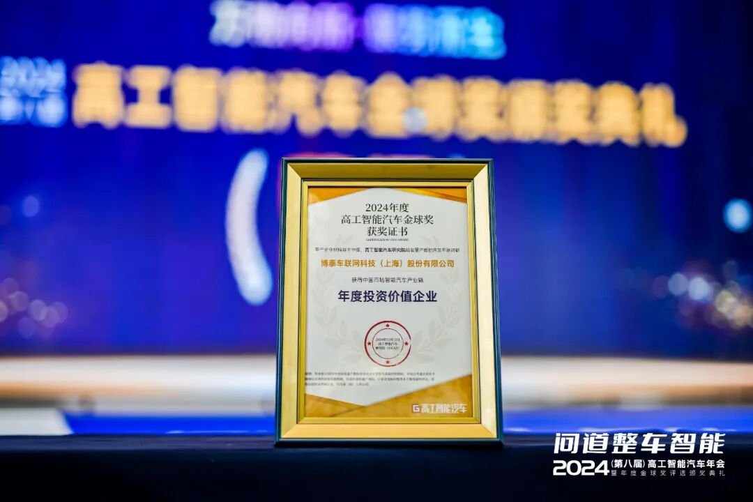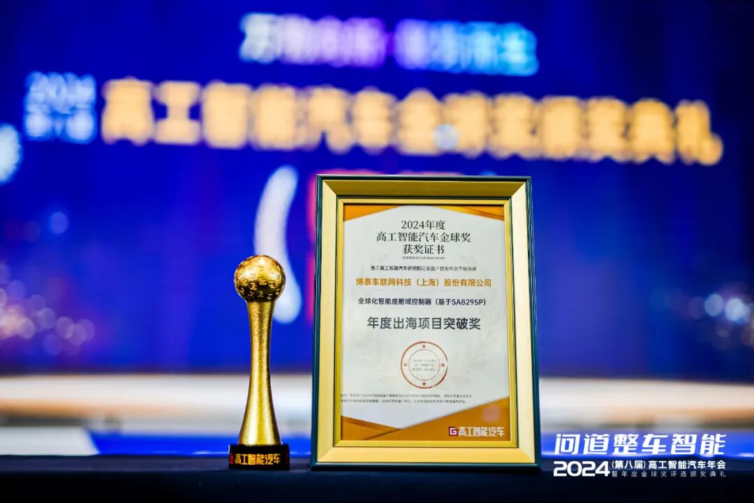 荣膺高工智能汽车——2024年度「金球奖」两大奖项 12月12日,在上海举行的2024高工智能汽车年会暨年度金球奖颁奖典礼上,博泰车联网凭借创新科技及卓越价值,一举斩获高工智能汽车金球奖——“中国市场智能汽车产业链年度投资价值企业奖”;其产品「全球化智能座舱域控制器 (基于SA8295P)」荣获“年度出海项目突破奖”。