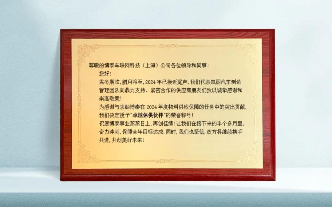 2024年市场环境多变,面对计划波动性大且备货周期短等诸多挑战,博泰车联网提前与下游供应商沟通优化交期,同时加强风险识别与预警机制,并有效落实应对措施,交付团队紧密协作、目标一致,随时联动各方资源向客户汇报交付动态,成功满足了客户增量的弹性需求,并实现100%的装车拉动满足率,为岚图汽车市场份额的提升提供了有力保障。岚图汽车制造管理团队为表彰博泰在2024年度物料供应保障任务中的突出贡献,授予博泰“卓越保供伙伴”荣誉称号!
