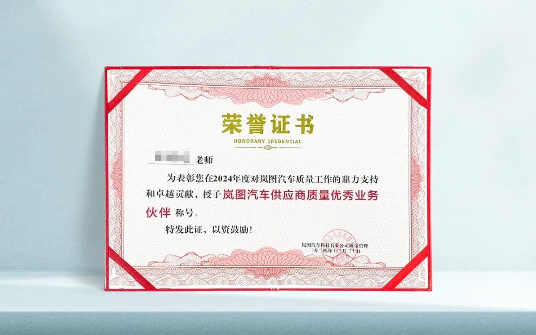 过去一年,岚图汽车先后推出多款车型,顺利完成“三年三品类、四年四款车”的战略布局。这一系列高品质产品的背后,离不开稳健的供应链质量体系的支撑,更离不开合作伙伴的大力支持。经岚图质量管理团队的全面评审,特表彰博泰车联网质量团队在2024年度对岚图汽车零部件质量工作的支持与贡献,并授予博泰车联网“供应商质量优秀业务伙伴”称号。