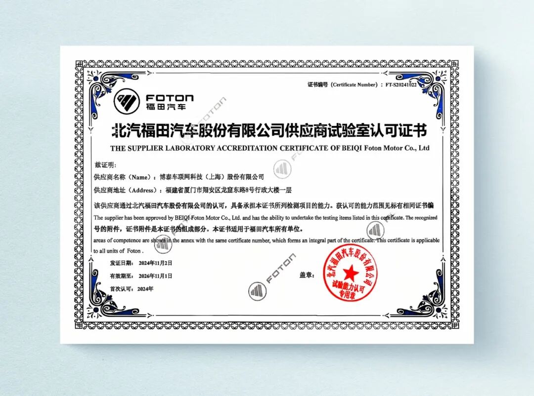 一直以来,博泰车联网凭借在技术创新、产品开发、应用场景和解决方案实施等方面的优势,始终在汽车智能化业务中保持领先地位。去年博泰车联网厦门中心实验室在管理体系、质量控制、技术能力等方面均满足北汽福田汽车的认可实验室要求,顺利获得北汽福田汽车实验室资质认可。