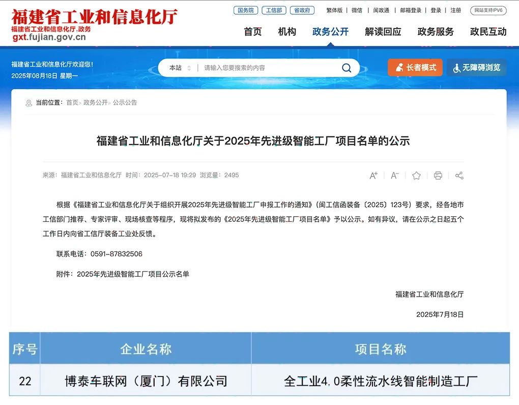 近日,福建省工业和信息化厅正式公布2025年“先进级智能工厂”名单。博泰车联网(厦门)有限公司(简称“博泰厦门基地”)凭借卓越的智能化实践,从全省众多申报企业中脱颖而出并成功入选,成为本年度全省唯一获此殊荣的智能制造车联网企业。此前,博泰厦门基地已多次获评“省市级智能制造示范工厂”,此次再获省级重磅认可,充分彰显其在智能制造领域的标杆地位。