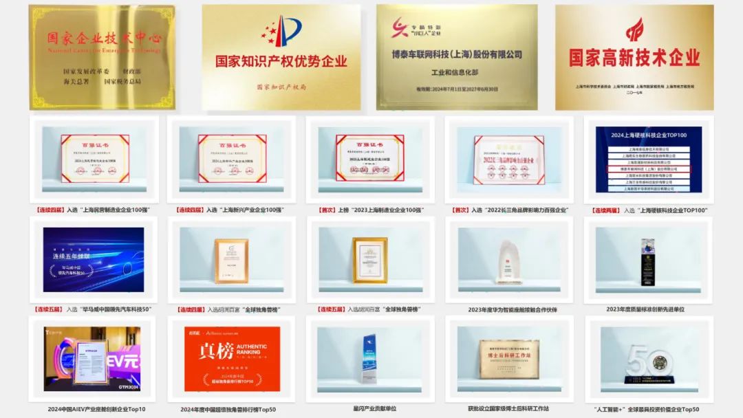 成立16年来,博泰坚持科技创新投入、推动汽车智能化产业发展,实现了多项技术突破:推出国内首个自研车规级操作系统、首款车载语音系统,以及全球首创的固态声场智能系统等。博泰践行创新使命,成为行业领先品牌,先后承担了多项国家级攻关项目,荣获“国家企业技术中心”、“国家知识产权优势企业”、“国家级专精特新小巨人” 等资质,并连续入选“上海民营制造业企业100强”、“上海新兴产业企业100强” 、“上海硬核科技企业TOP100” 、“胡润百富全球独角兽榜” 、“毕马威汽车科技 50”、“世界物联网 500 强” 等榜单。这充分体现了国家政府及行业对博泰在中国智能汽车行业科技创新实力和发展动力的高度认可。