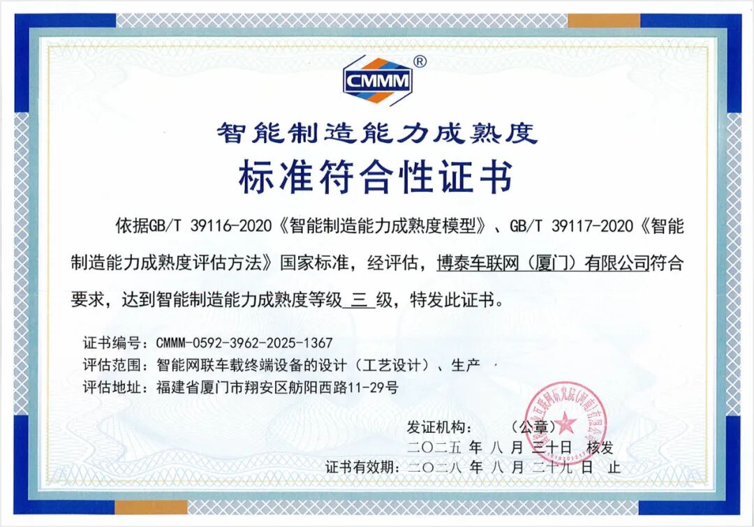 近日,博泰车联网科技(厦门)有限公司(简称“博泰厦门基地”)顺利通过智能制造能力成熟度三级评估(CMMM三级),成为福建省首家获得该级别认证的车联网企业。这一认证标志着企业在智能制造领域已达到国内先进水平,并在推进新质生产力发展、促进行业智能化转型方面发挥示范作用。