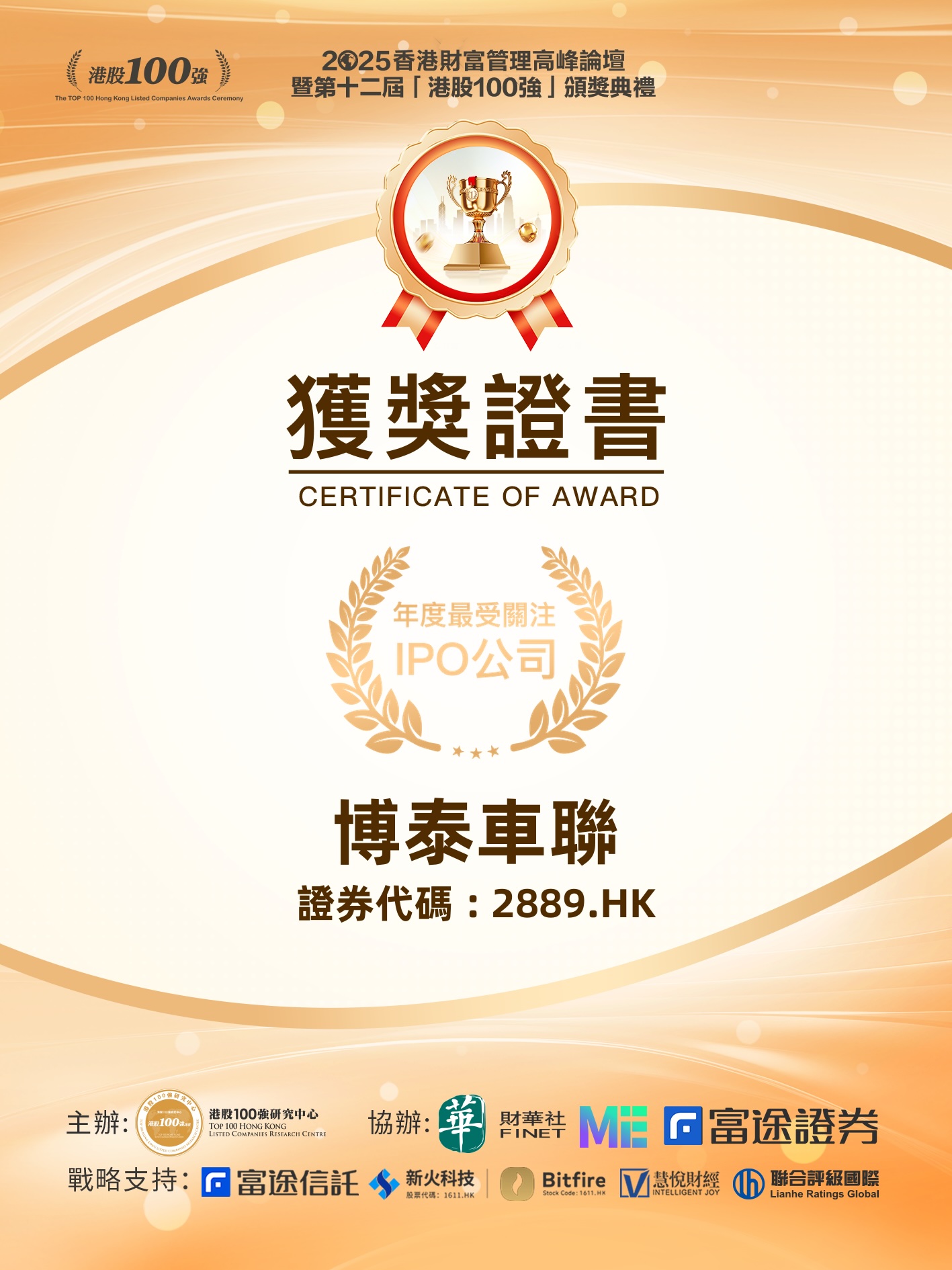 2026年1月9日,由港股100强研究中心主办,财华社、ME、富途证券联合协办的“2025香港财富管理高峰论坛暨第十二届港股100强颁奖典礼”在香港会展中心隆重举行。作为“港股智能座舱第一股”,博泰车联(2889.HK)凭借扎实的技术壁垒、持续的成长动能与广阔的市场前景,成功荣获“年度最受关注IPO公司”奖项。这一荣誉不仅体现了资本市场对博泰车联IPO表现与投资价值的高度认可,也代表了行业对公司推动汽车智能化产业升级的充分肯定。