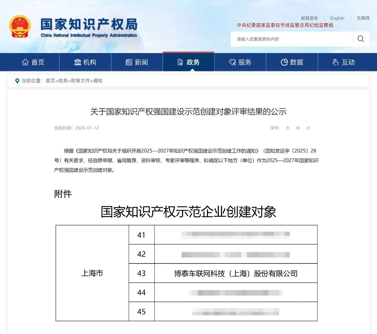 近日,国家知识产权局经党和国家功勋荣誉表彰工作委员会办公室批准,组织开展了2025—2027年知识产权强国建设示范创建工作。博泰车联网科技(上海)股份有限公司(以下简称“博泰车联”)凭借在知识产权创造、运用、保护、管理等方面的系统化成果与突出实力,成功入选为首届“国家知识产权示范企业创建对象”。