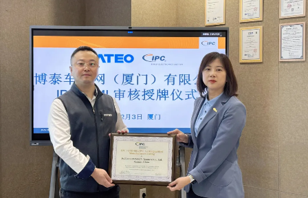 博泰车联网厦门制造基地经过IPC严格的审核,生产工艺与产品质量符合电子行业国际标准IPC-A-610《电子组件的可接受性》与J-STD-001《电气与电子组件的焊接要求》,顺利通过IPC QML审核,荣列IPC